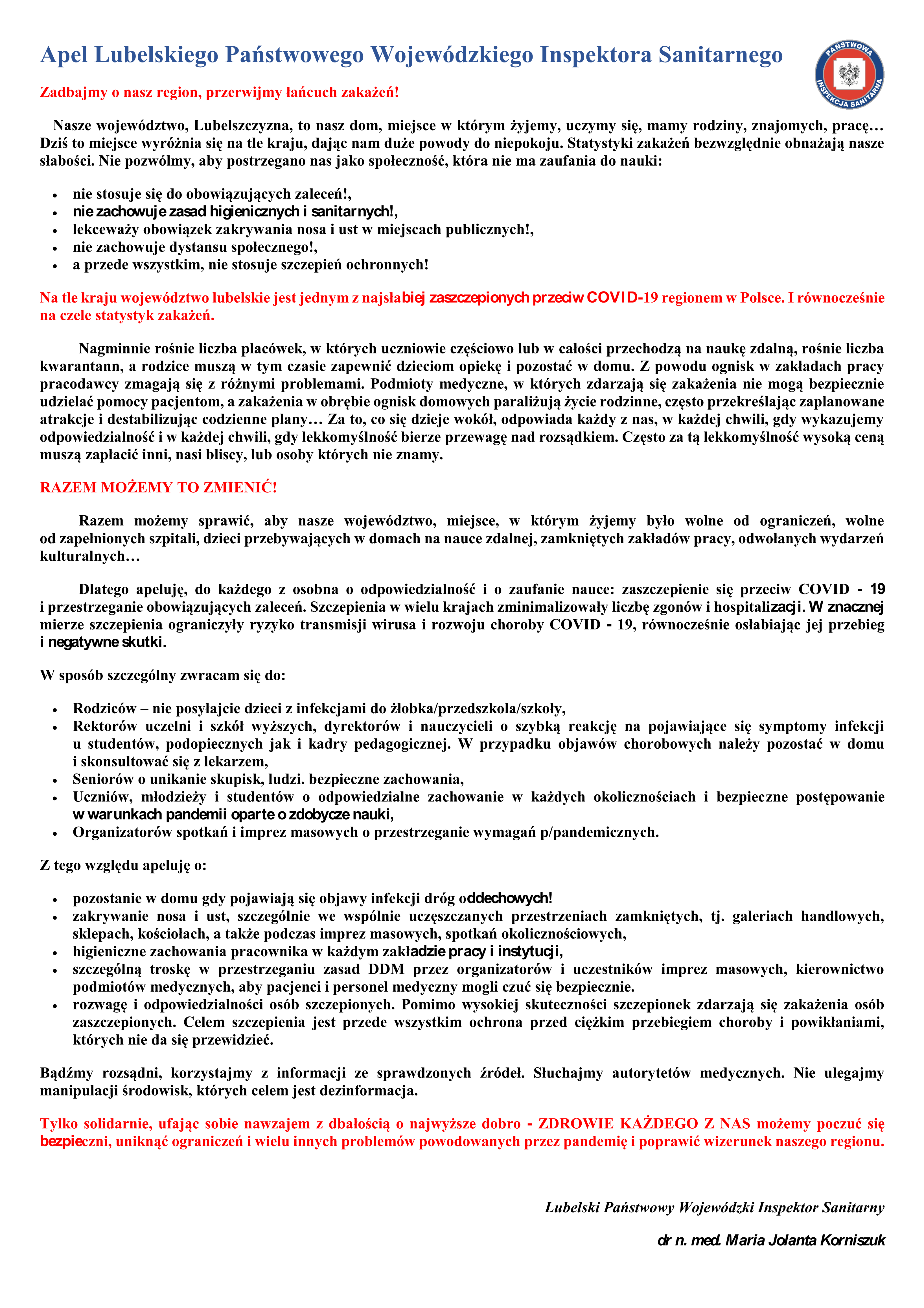 „Apel Lubelskiego Państwowego Wojewódzkiego Inspektora Sanitarnego”