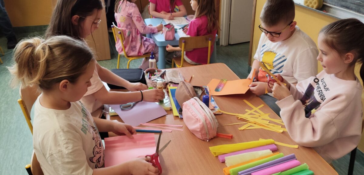 Uczniowie wykonali piękne kwiaty z kolorowego papieru, malowali Panią Wiosnę oraz wspólnie przystroili gaik. Na świeżym powietrzu zawiesili na płocie gałązkę ozdobioną barwną bibułą, wprowadzając prawdziwie wiosenny nastrój.